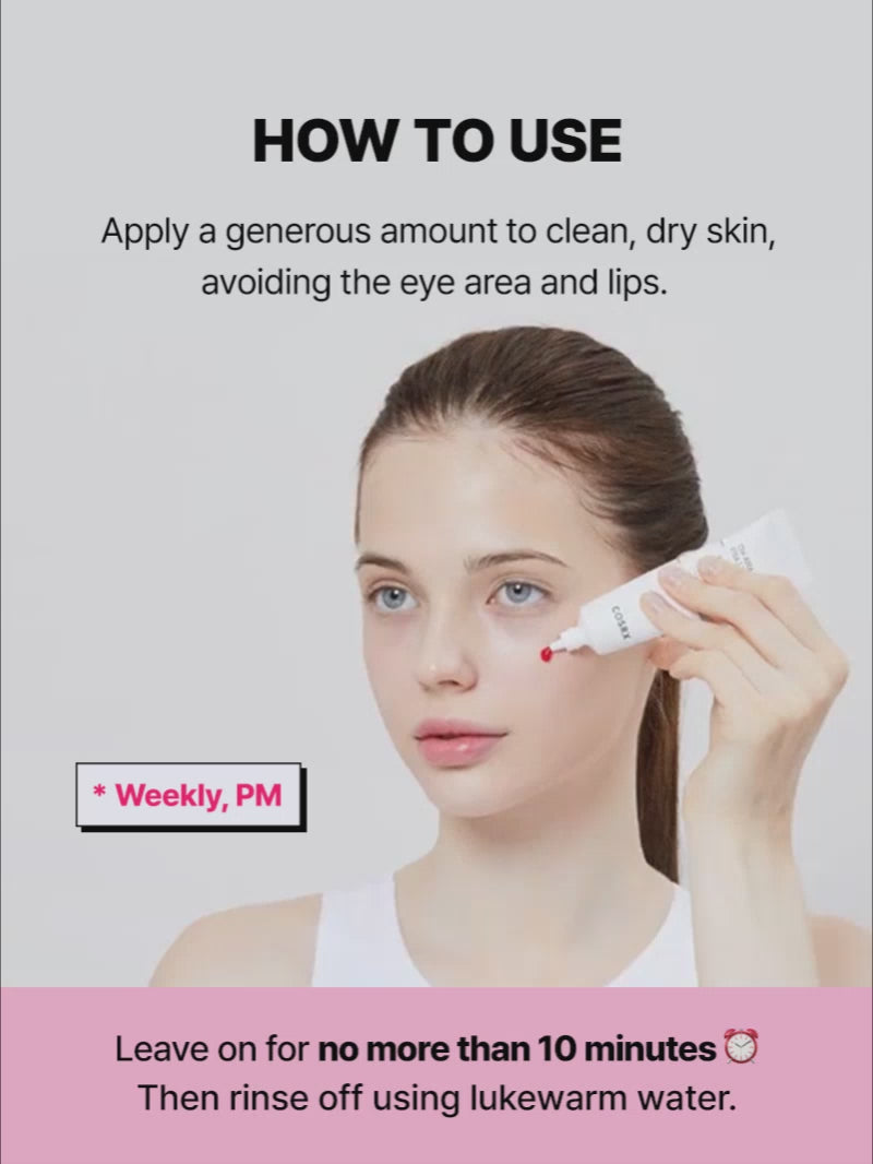 Use once a week/PM. Apply a generous amount to clean, dry skin, avoiding the eye area and lips. Leave on for no more than 10 minutes and then rinse off using lukewarm water. *Patch test is recommended before use