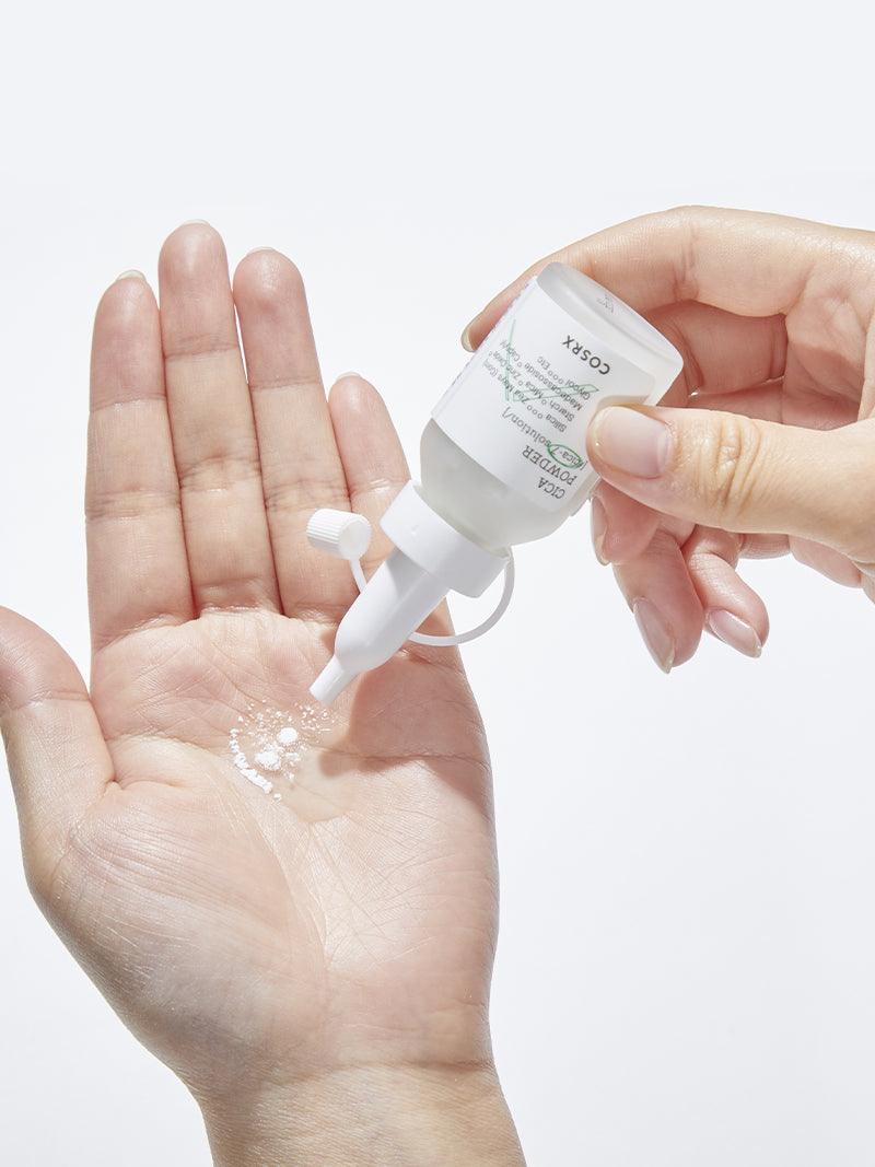 - Dispense the Cica Powder onto your palm by lightly tapping the bottom of the container 1 -? 2 times.